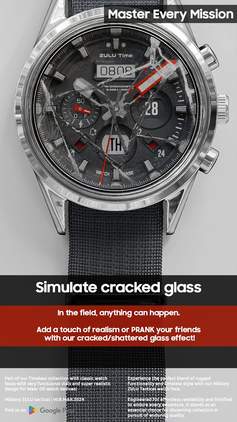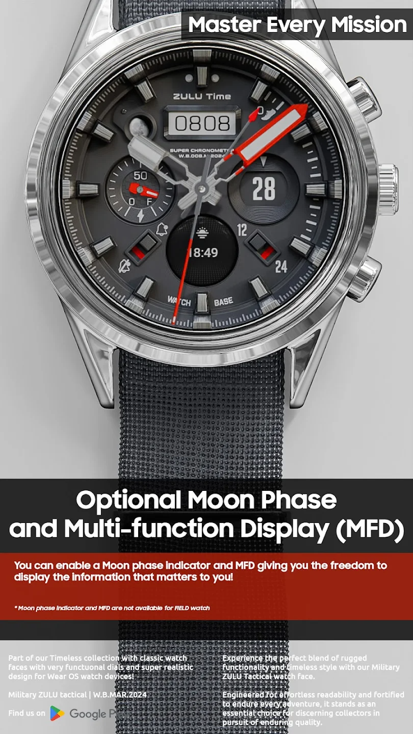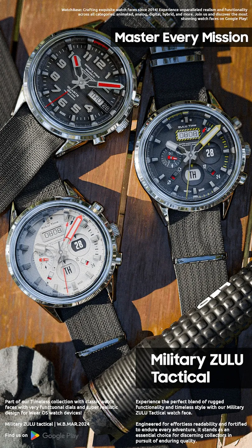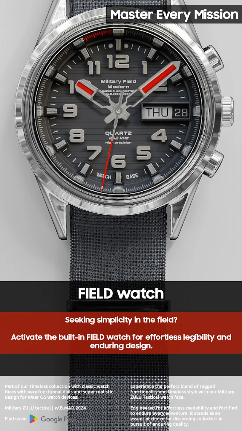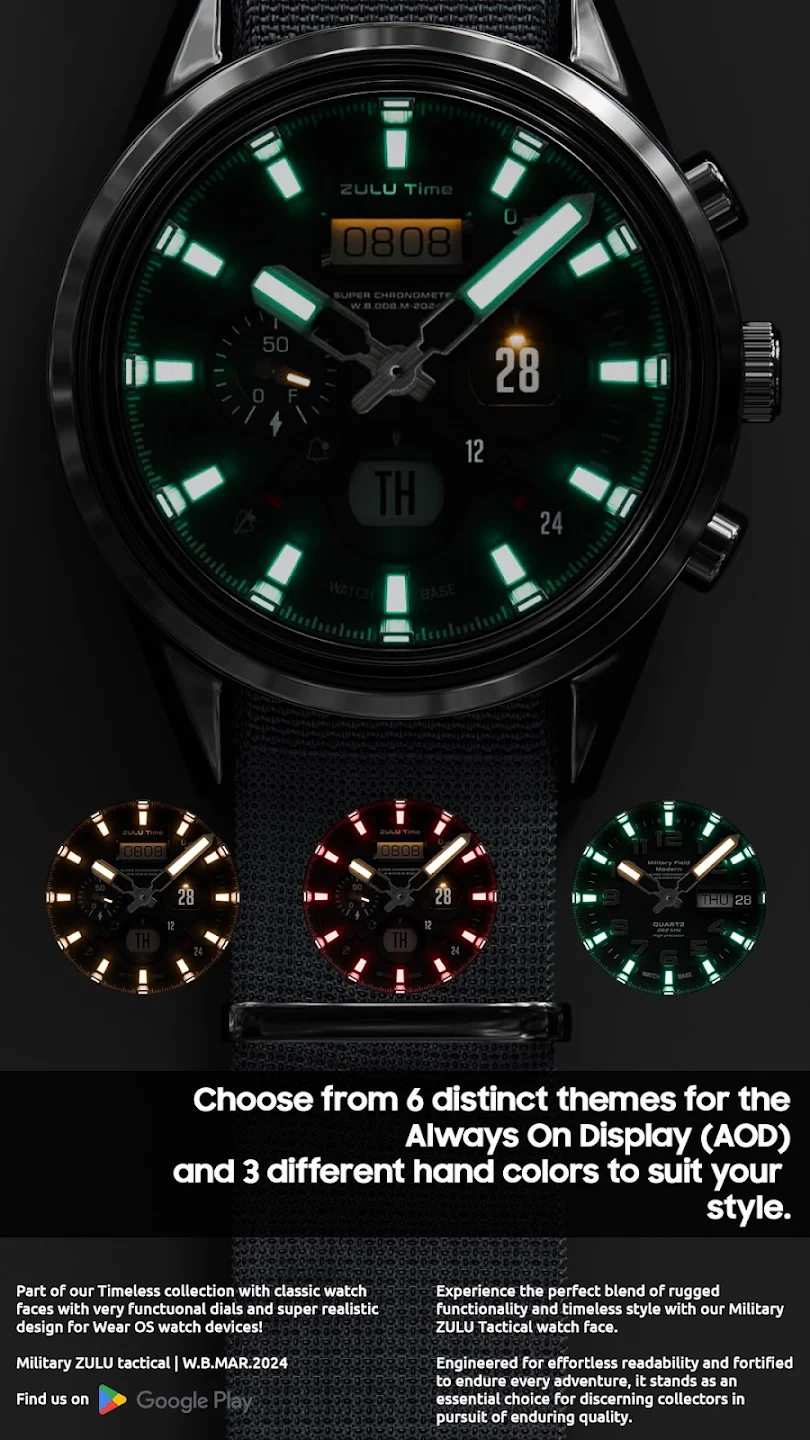 Military ZULU Tactical watch siap rombak tampilan smartwatch kamu jadi keren dan macho. Aplikasi watch face untuk smartwatch di Android ini cocok bagi penyuka gaya taktikal militer.