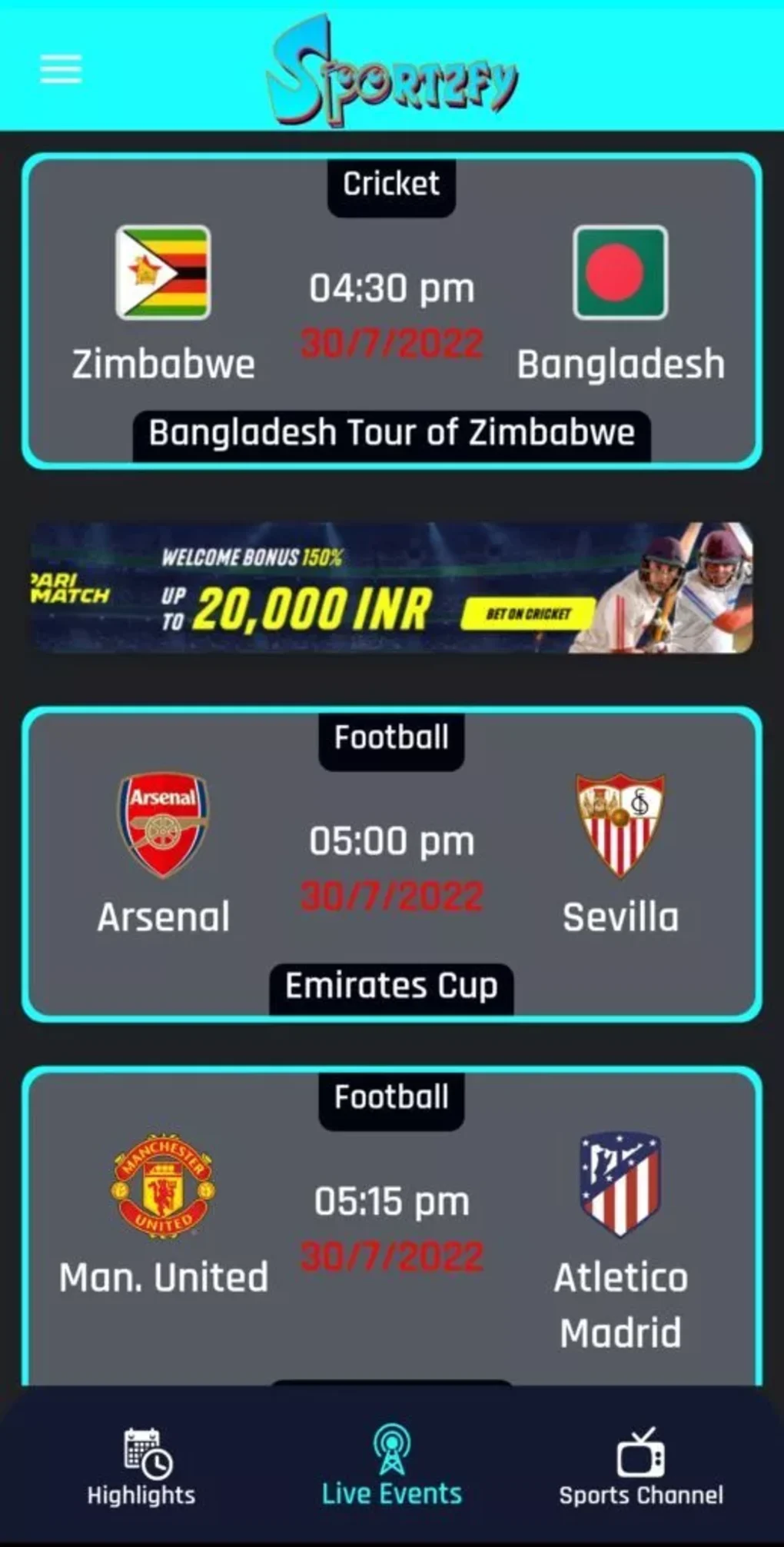 Sportzfy merupakan solusi bagi yang ingin streaming pertandingan olahraga. Bukan hanya sepak bola, melainkan tersedia beberapa olahraga lain yang juga bisa kamu tonton siaran langsungnya melalui aplikasi ini.